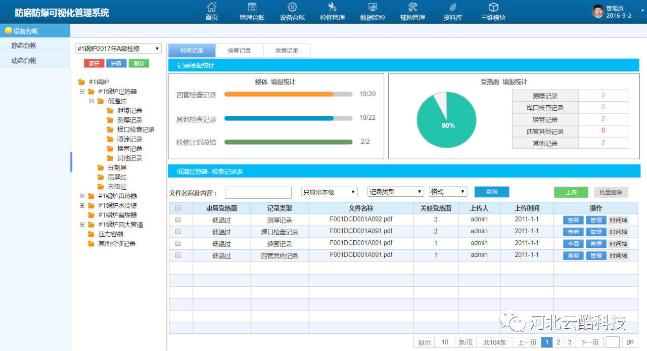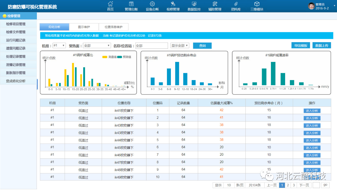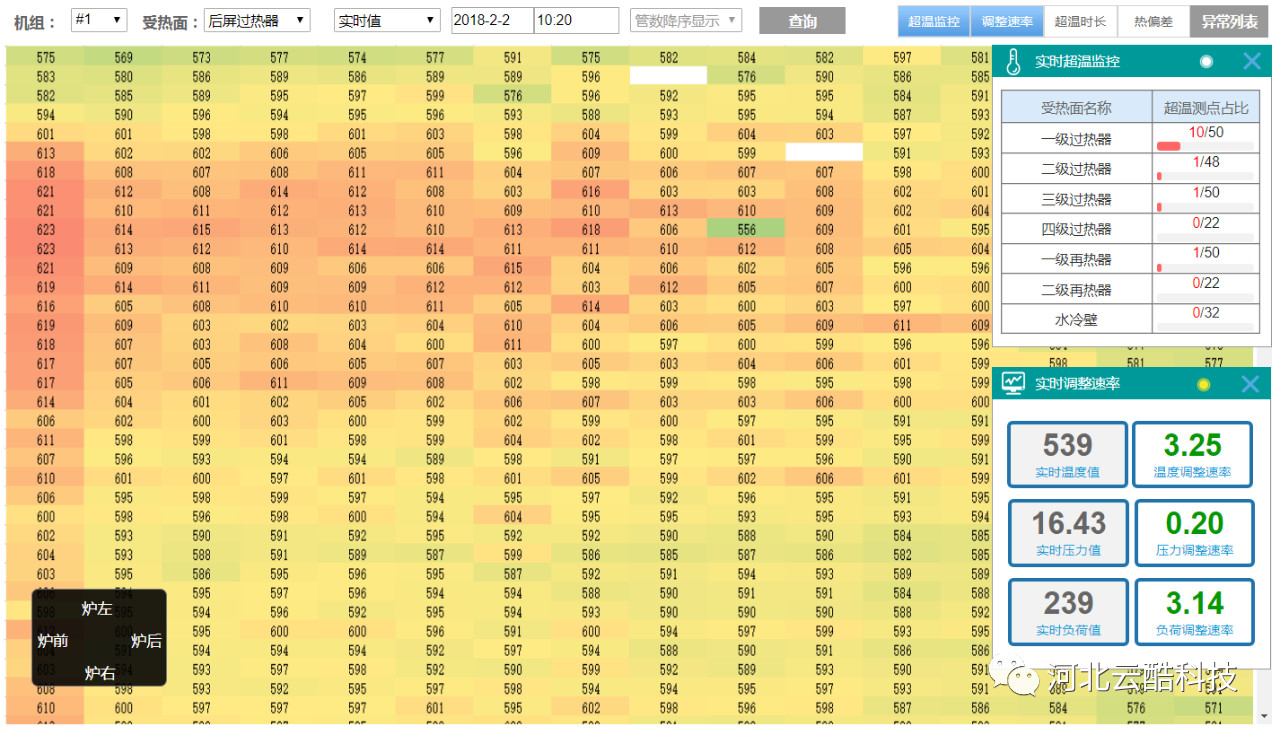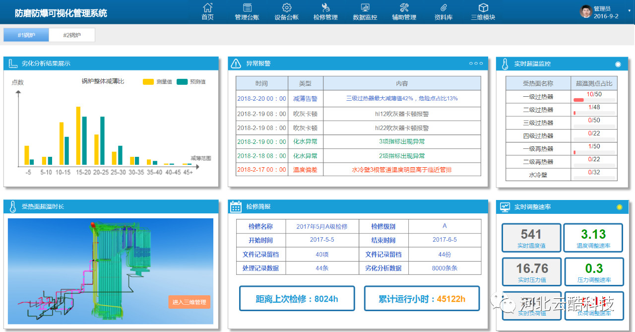 三維可視化防磨防爆管理系統(tǒng)基于云酷科技自主研發(fā)CDP快速開發(fā)平臺開發(fā),基于該平臺實現在多系統(tǒng)、多平臺、多種數據庫之間進行數據抽取與存儲,方便業(yè)務的后續(xù)拓展與實現。系統(tǒng)內置多種數據監(jiān)控模型與大數據分析模型,為相關數據的監(jiān)控分析,受熱面的減薄預測提供了算法基礎。系統(tǒng)與三維可視化模塊高度結合,通過三維可視化模塊可直觀高效的瀏覽鍋爐結構,查看相關動靜態(tài)臺帳、換管數據、泄爆數據、以及壁溫監(jiān)控等各類信息,方便用戶及時掌握狀態(tài)與劣化規(guī)律。例如焊口問題,三維化的鍋爐可以讓相關人員清楚的看到焊口位置、材質,異種鋼焊口以不同顏色標識,便于鍋爐防磨防爆檢修管理。在四管在線監(jiān)測測點部分,可以快速查看可能泄漏的焊口位置,提前準備材料,為鍋爐四管泄漏搶修贏得寶貴的時間,提高機組運行效率。部分功能如下:綜合監(jiān)控作為系統(tǒng)核心信息的集中展現窗口,包含機組劣化分析(減薄狀態(tài))、異常報警信息、實時壁溫監(jiān)控、鍋爐檢修簡報、實時調整速率監(jiān)控等功能模塊,方便管理人員快速掌握機組當前狀態(tài)。系統(tǒng)將管理體系臺賬,涵蓋鍋爐四管、聯箱、壓力容器、支吊架、四大管道、以及爐外管道等相關設備的基本靜態(tài)臺賬,檢修文件的歸檔統(tǒng)計以及各類處理記錄的動態(tài)臺賬綜合展現管理。檢修管理貫穿鍋爐檢修的全過程管理,包含:檢修項目管理、檢修文件歸檔、處理記錄管理、膨脹指示管理、泄爆記錄管理、以及重點位置劣化分析等功能。泄爆記錄用于鍋爐泄爆記錄的管理與分析。支持泄爆基本信息如泄爆位置、時間、主要原因、次要原因的錄入以及泄爆分析報告的歸檔與查詢。鍋爐受熱面的腐蝕減薄受到鍋爐本體運行狀態(tài)、吹灰器運行狀態(tài)、化水質量、煤質變化等多方面的影響。數據監(jiān)督管理用于收集匯總運行、化水、吹灰、燃煤等相關數據,并進行實時的綜合監(jiān)控、分析與報警。涵蓋鍋爐四管、連接管道、進出口集箱、分離器、給水管道以及主再熱蒸汽管道等設備。通過三維模型可直觀查看鍋爐結構、材質分布、焊口位置等基礎物理結構信息,同時可關聯查詢設備靜態(tài)臺帳信息、動態(tài)臺帳信息、壁溫監(jiān)控信息、劣化分析信息,并支持標記模式,處理模式、泄爆模式、劣化模式等。三維可視化技術能夠將枯燥數據進行直觀展示的實用型工具,鍋爐防磨防爆管理又是電廠安全管理必不可少的工作,兩種技術的結合,能夠極大的改變原有工作中的問題,使鍋爐安全工作走向真正的智慧化。