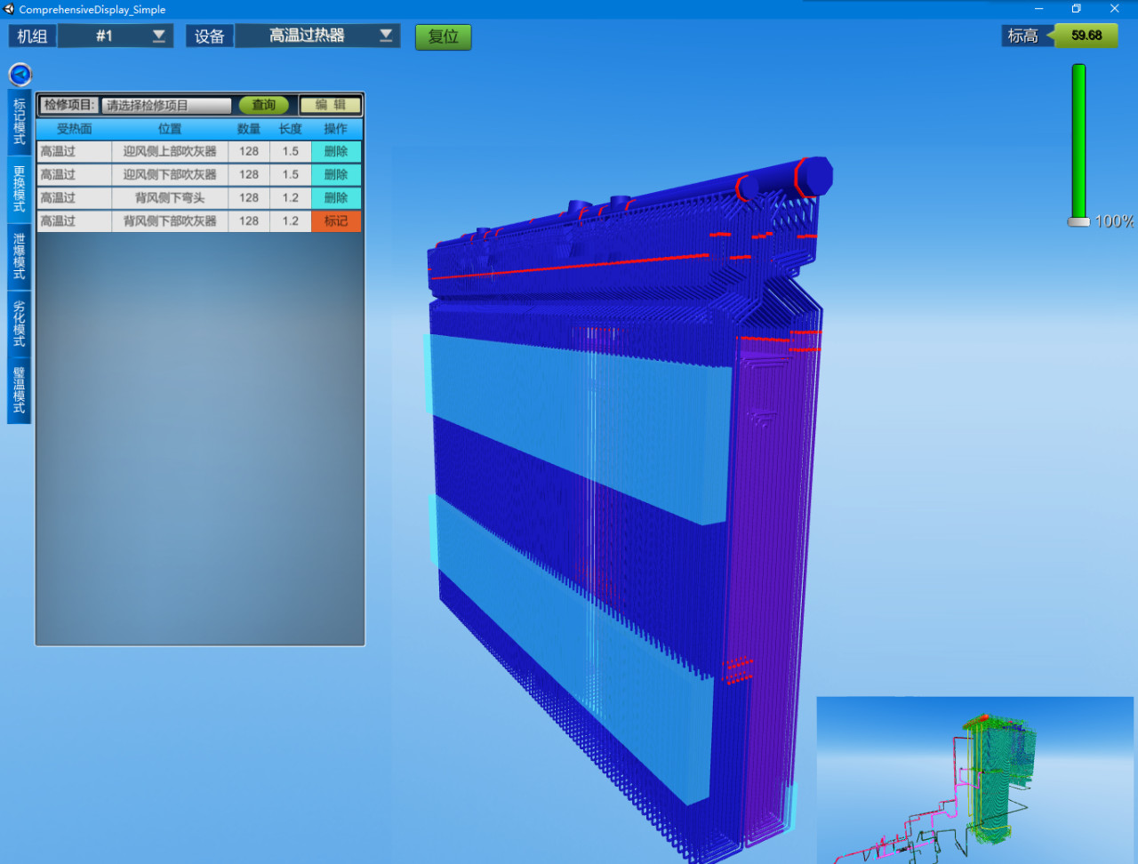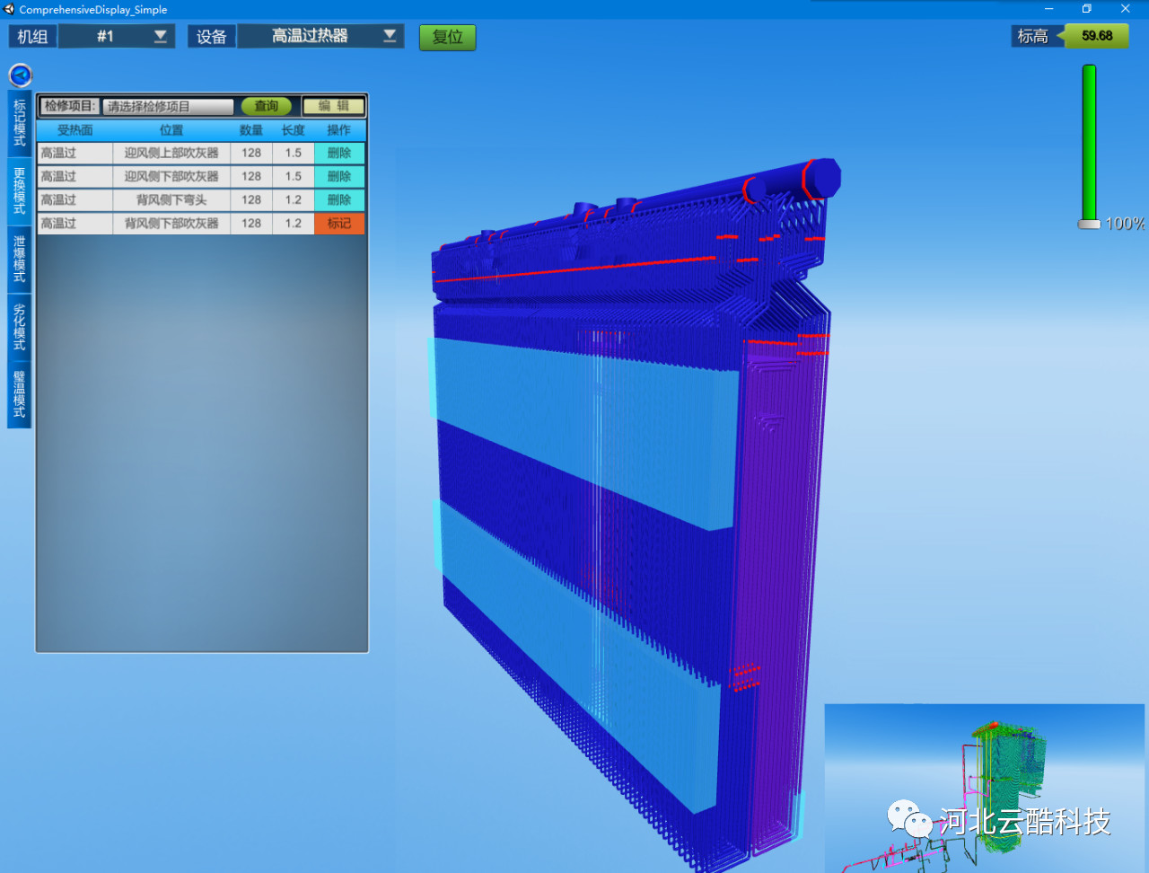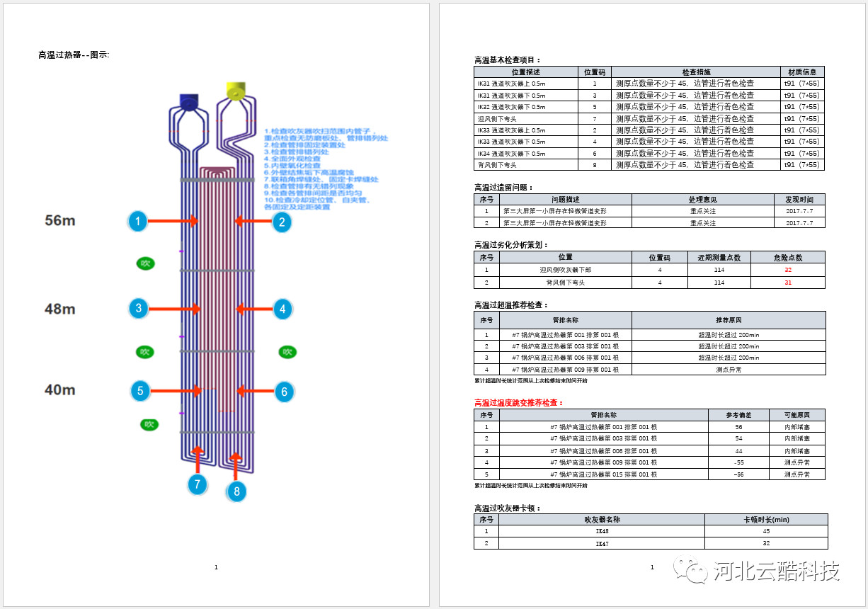 三維可視化防磨防爆管理系統(tǒng)基于云酷科技自主研發(fā)CDP快速開發(fā)平臺開發(fā),基于該平臺實現在多系統(tǒng)、多平臺、多種數據庫之間進行數據抽取與存儲,方便業(yè)務的后續(xù)拓展與實現。系統(tǒng)內置多種數據監(jiān)控模型與大數據分析模型,為相關數據的監(jiān)控分析,受熱面的減薄預測提供了算法基礎。系統(tǒng)與三維可視化模塊高度結合,通過三維可視化模塊可直觀高效的瀏覽鍋爐結構,查看相關動靜態(tài)臺帳、換管數據、泄爆數據、以及壁溫監(jiān)控等各類信息,方便用戶及時掌握狀態(tài)與劣化規(guī)律。例如焊口問題,三維化的鍋爐可以讓相關人員清楚的看到焊口位置、材質,異種鋼焊口以不同顏色標識,便于鍋爐防磨防爆檢修管理。在四管在線監(jiān)測測點部分,可以快速查看可能泄漏的焊口位置,提前準備材料,為鍋爐四管泄漏搶修贏得寶貴的時間,提高機組運行效率。部分功能如下:綜合監(jiān)控作為系統(tǒng)核心信息的集中展現窗口,包含機組劣化分析(減薄狀態(tài))、異常報警信息、實時壁溫監(jiān)控、鍋爐檢修簡報、實時調整速率監(jiān)控等功能模塊,方便管理人員快速掌握機組當前狀態(tài)。系統(tǒng)將管理體系臺賬,涵蓋鍋爐四管、聯箱、壓力容器、支吊架、四大管道、以及爐外管道等相關設備的基本靜態(tài)臺賬,檢修文件的歸檔統(tǒng)計以及各類處理記錄的動態(tài)臺賬綜合展現管理。檢修管理貫穿鍋爐檢修的全過程管理,包含:檢修項目管理、檢修文件歸檔、處理記錄管理、膨脹指示管理、泄爆記錄管理、以及重點位置劣化分析等功能。泄爆記錄用于鍋爐泄爆記錄的管理與分析。支持泄爆基本信息如泄爆位置、時間、主要原因、次要原因的錄入以及泄爆分析報告的歸檔與查詢。鍋爐受熱面的腐蝕減薄受到鍋爐本體運行狀態(tài)、吹灰器運行狀態(tài)、化水質量、煤質變化等多方面的影響。數據監(jiān)督管理用于收集匯總運行、化水、吹灰、燃煤等相關數據,并進行實時的綜合監(jiān)控、分析與報警。涵蓋鍋爐四管、連接管道、進出口集箱、分離器、給水管道以及主再熱蒸汽管道等設備。通過三維模型可直觀查看鍋爐結構、材質分布、焊口位置等基礎物理結構信息,同時可關聯查詢設備靜態(tài)臺帳信息、動態(tài)臺帳信息、壁溫監(jiān)控信息、劣化分析信息,并支持標記模式,處理模式、泄爆模式、劣化模式等。三維可視化技術能夠將枯燥數據進行直觀展示的實用型工具,鍋爐防磨防爆管理又是電廠安全管理必不可少的工作,兩種技術的結合,能夠極大的改變原有工作中的問題,使鍋爐安全工作走向真正的智慧化。